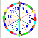 The 12 Zodiac signs shown in a circular mode where E is the Eastern Horizon where the ascendant is located. Aries is the first Sign referenced as 1. The span of any sign is 30 degrees. Outer sectors on this circular chart are the 27 stars allocated to Ketu, Venus, Sun, Moon, Mars, Rahu, Jupiter, Saturn and Mercury.