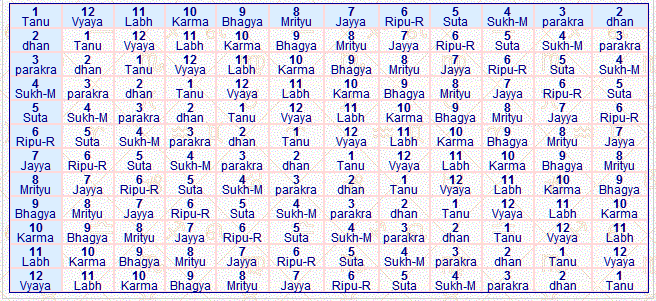 Column-1 & Row-1 are the reference cells. If you wish to know which house will be the house of gains or the 11th house of your 2nd house, follow along Row-2 from the left & look for H-11 along the top row. You will find house-12 as the one which will provide for a healthy financial position & a happy family environment. It then becomes mandatory on your part to invest your resources or expend yourself so as to gain on those fronts. If the lord of the 12th house is weak or there are no planets in its stars or any planet occupying the 12th house without any planet in its stars would imply that the 12th house is not strong and so effectively the 2nd house results will be average. The lord of such a house and or any planet occupying the 12th house will, from the house occupied provide for through its star-lord a limited set of effects.