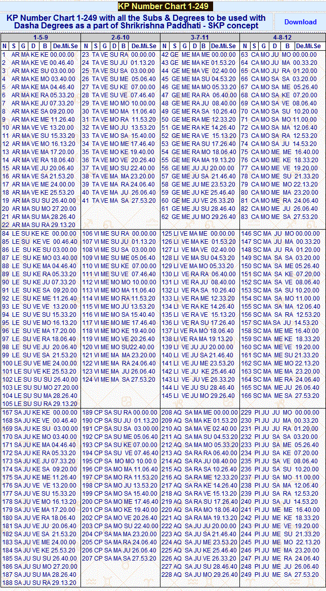 --KP Numbers 1 to 249 have a Sign, Sign-Lord, Star-Lord and Sub-Lord--