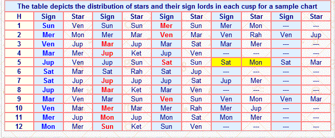 In the table below you will notice on the 1st cusp we will have 2 owners due to the division of the stars arising due to the cusp of 1st house being located in the middle of a sign. In effect Sun and Mercury shall become the Co-owners of the 1st house. Likewise each cusp has co-owners, due to this division or sharing of ownership results will be modified. This is a part of Shrikrishna Paddhati -SKP.